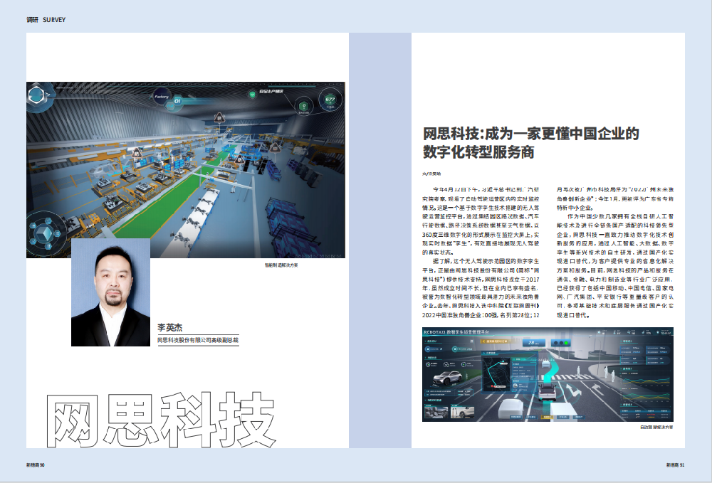 近日,网思科技高级副总裁李英杰先生接受了《新穗商》杂志2023年第6期的「专精特新」企业发展专题采访。该杂志专供广州市委、市政府、市职能部门以及广州市工商联近2000家执委企业阅示,致力于为政府提供决策参考。通过该杂志的报道,有效提升了网思科技在广州政府中的影响力。本文首发于《新穗商》策划|